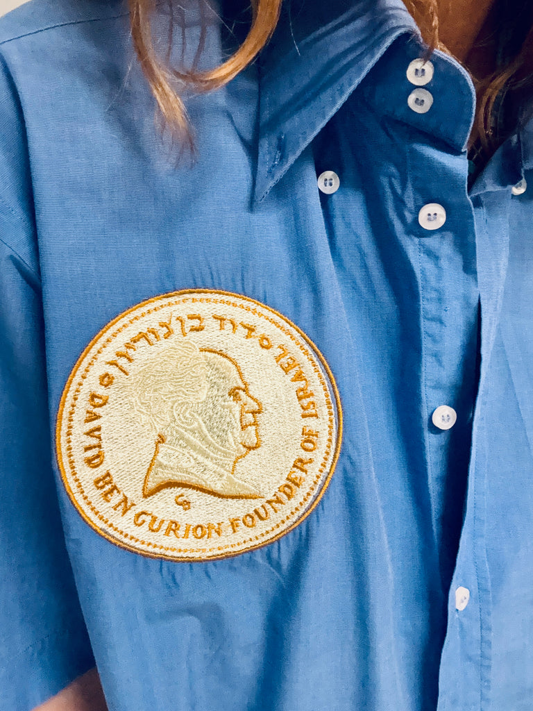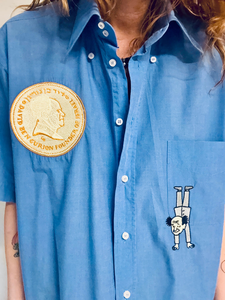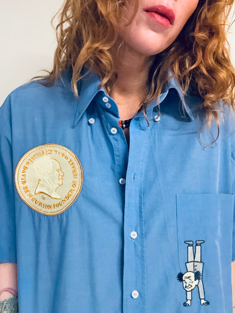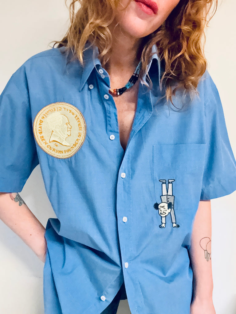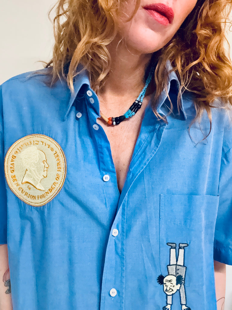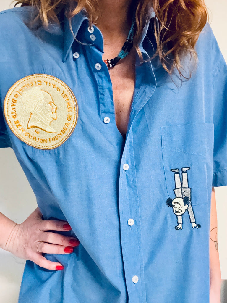 Chemisette bleue d’homme , vintage, brodée , pièce unique ..