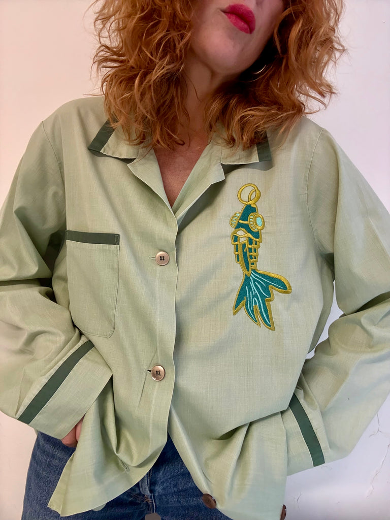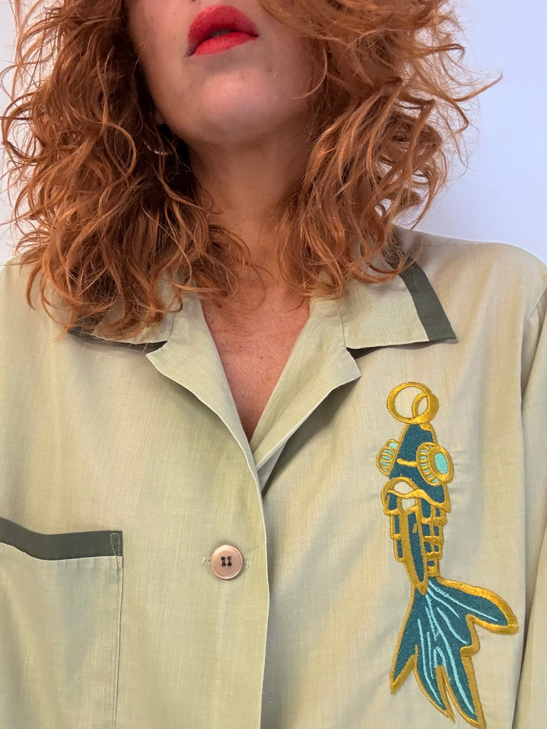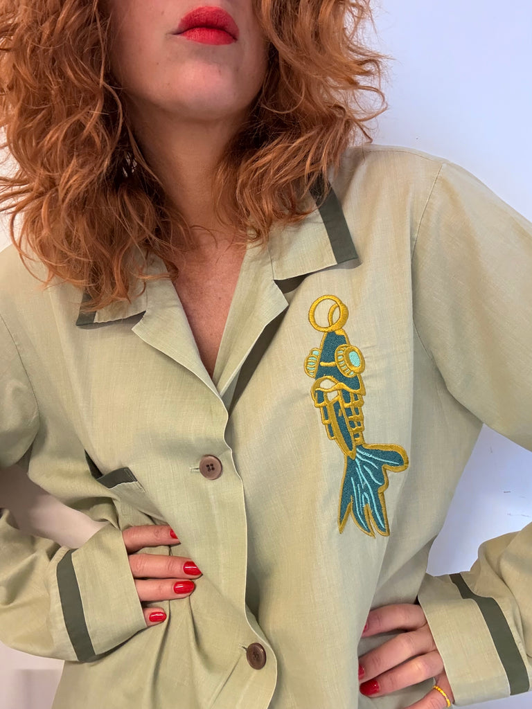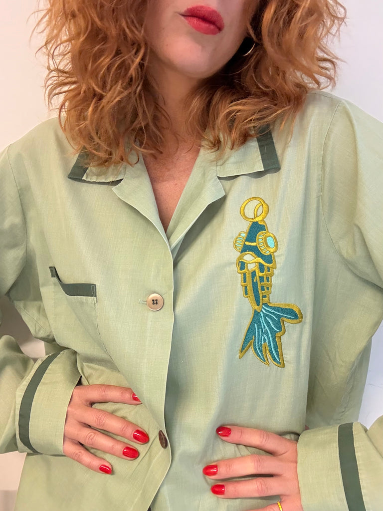 Chemise, super légère verte, comme un pyjama, brodée avec un gros poisson ! Pièce unique