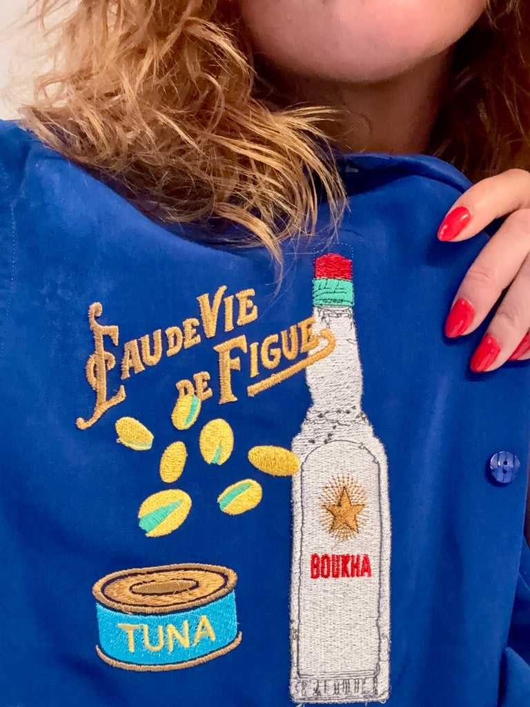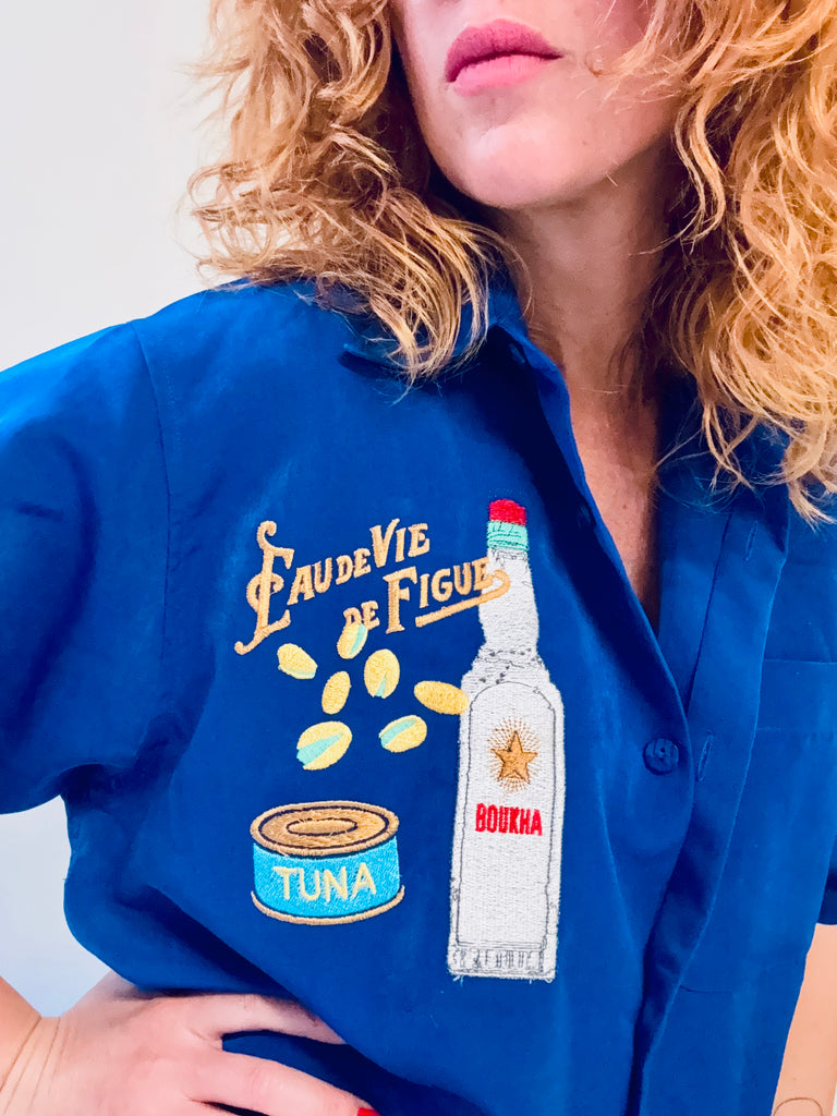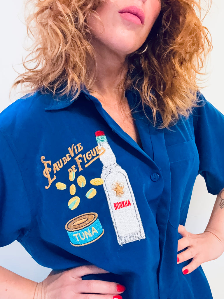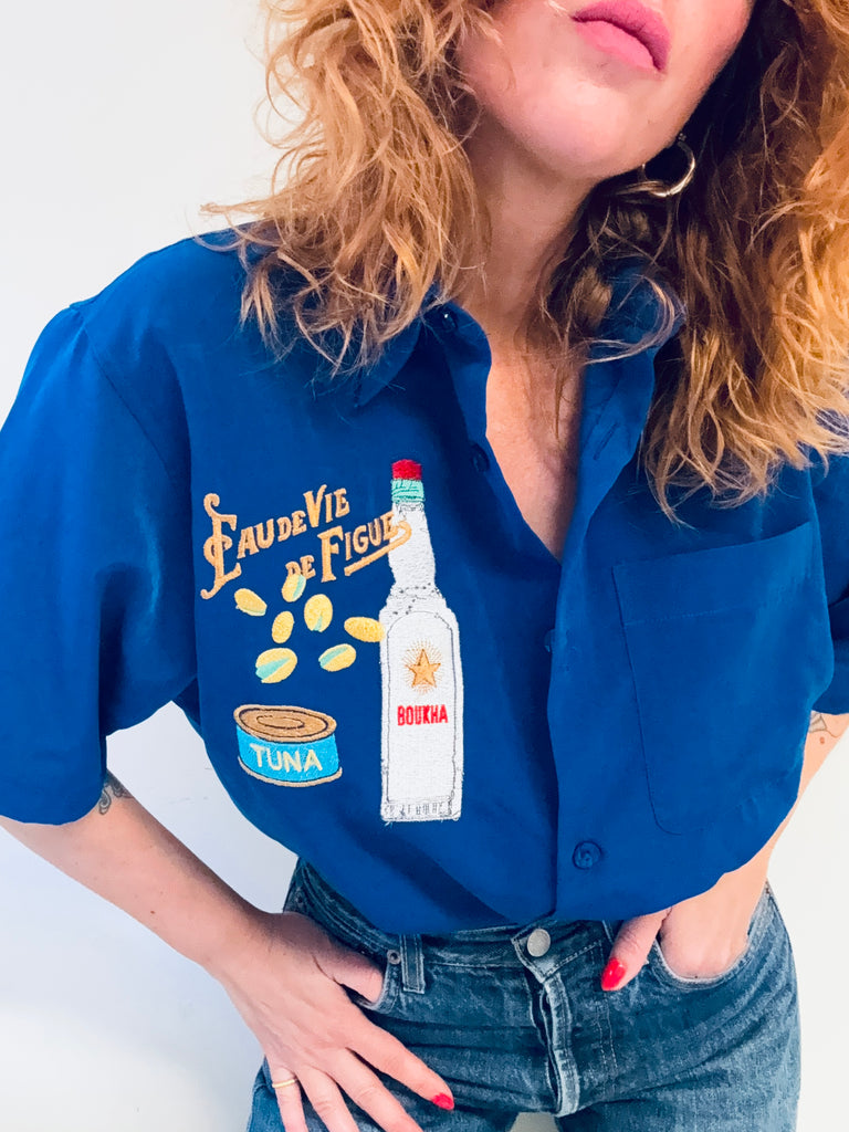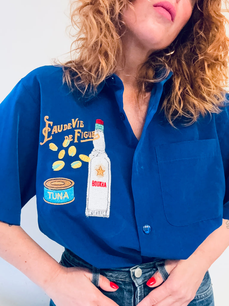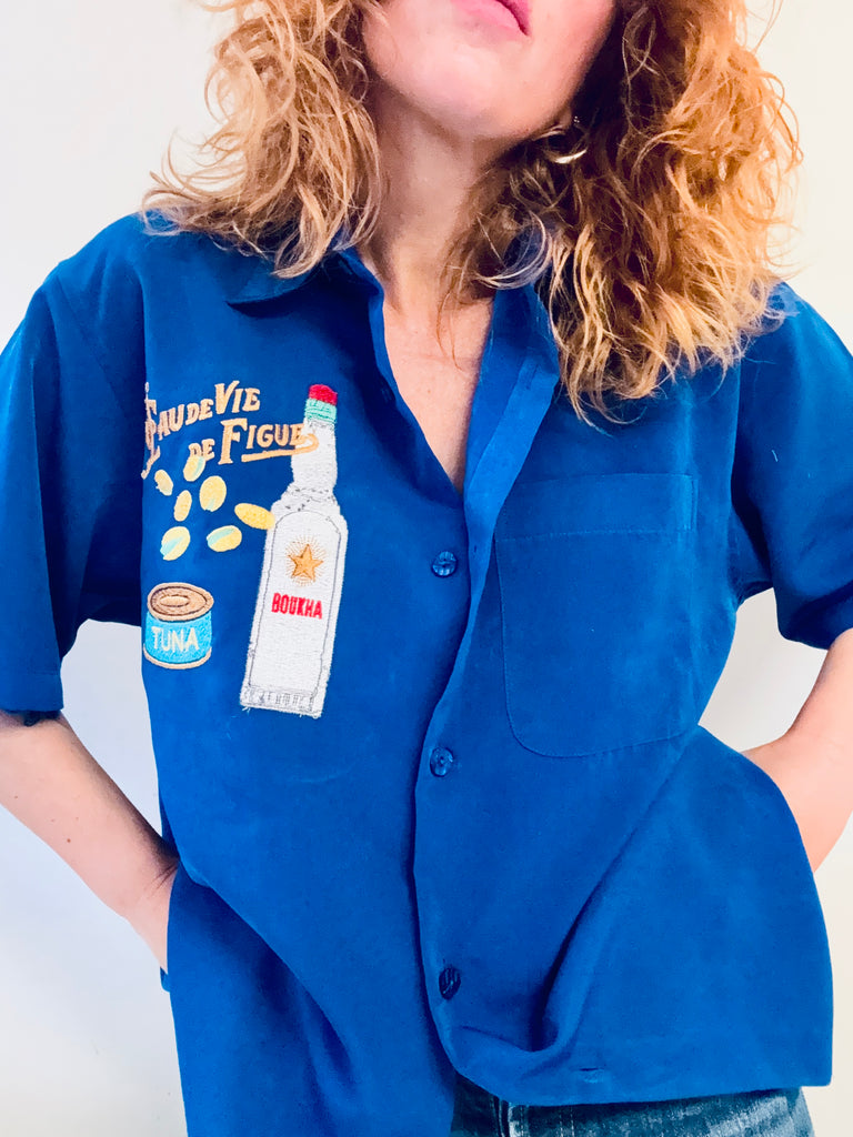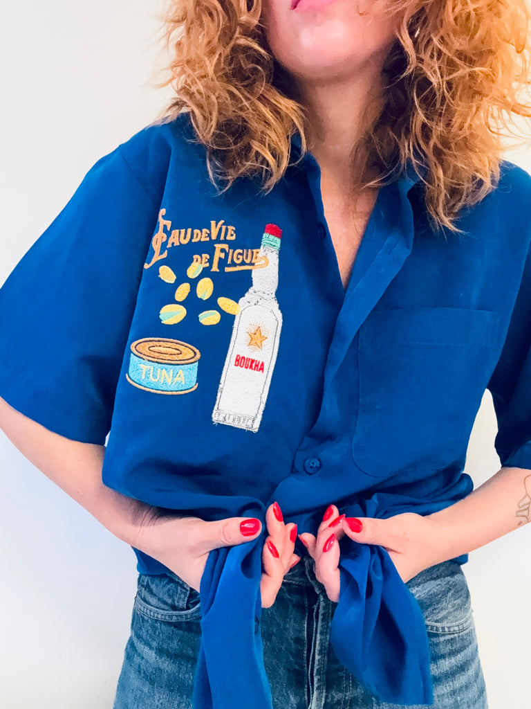 Chemisette bleu roi , matière douce, comme trompe-l’œil daim , brodée , loose , pièce uniqueÂ