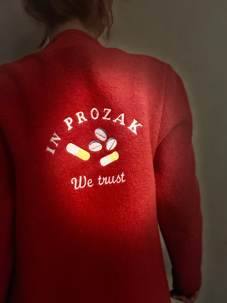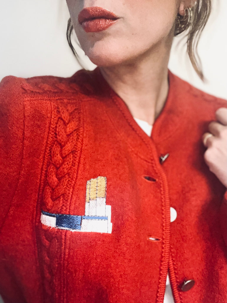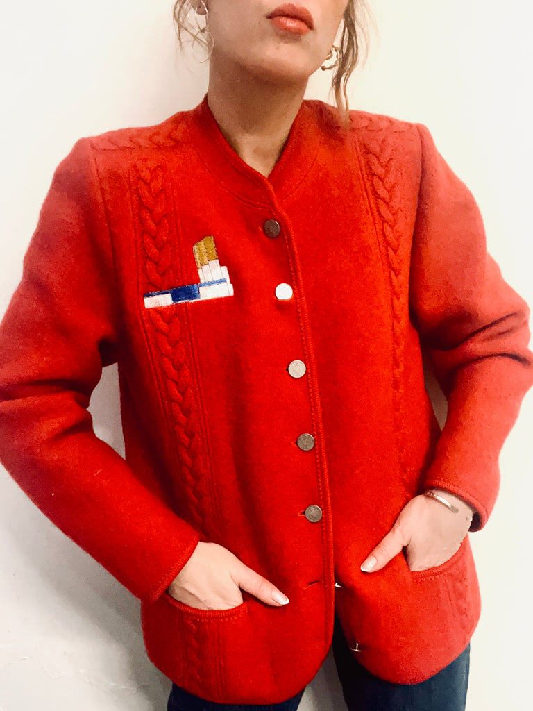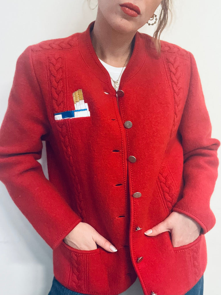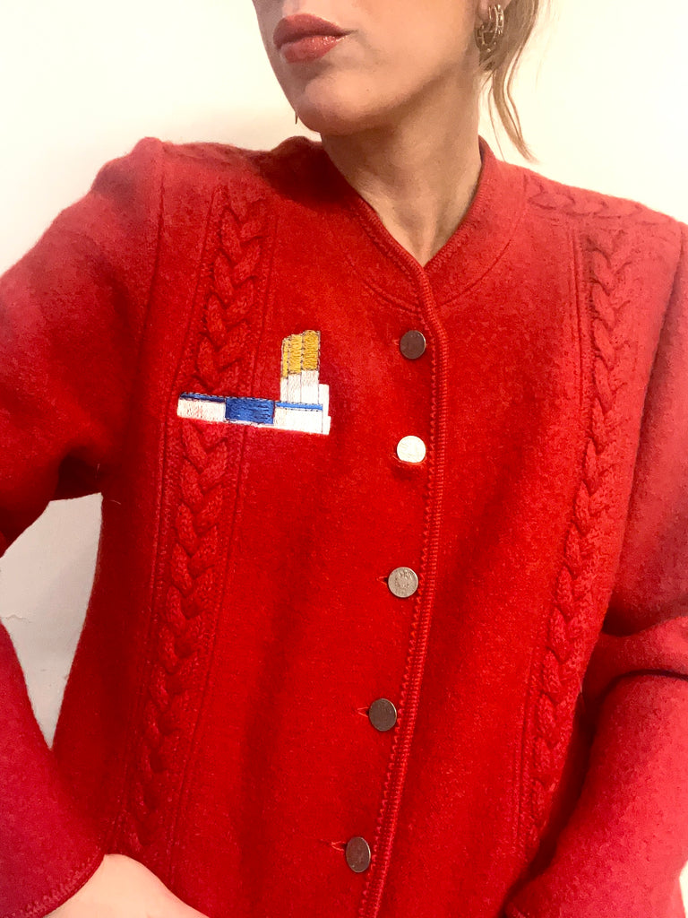 Veste en laine rouge, vintage , impeccable , brodée , pièce unique