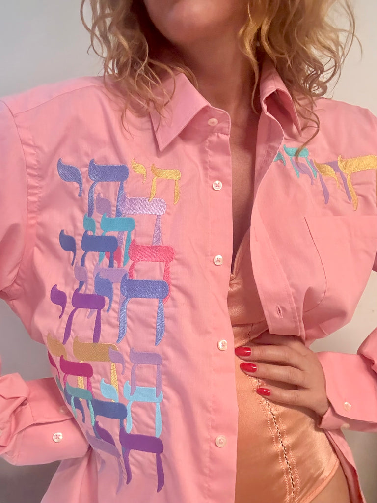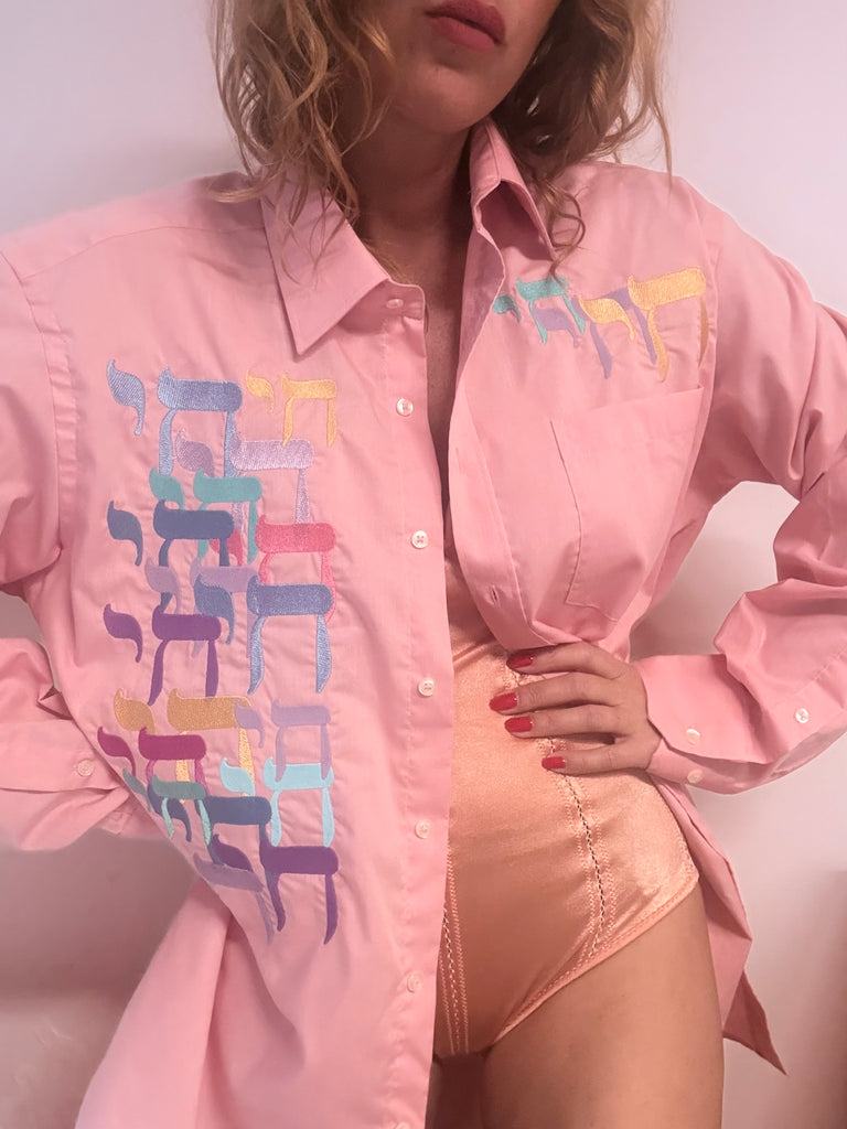 Chemise rose , manches longues , super loose , toute brodée , pièce unique 🩷
