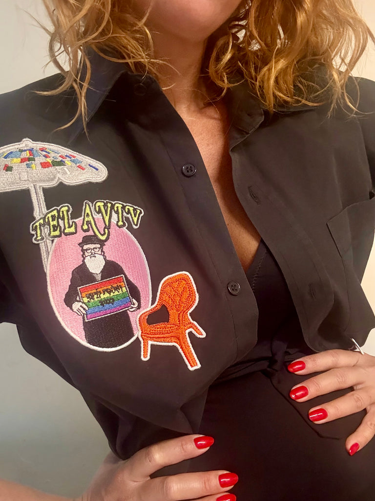 Chemise noire , Manches longues, loose , brodée et patchee