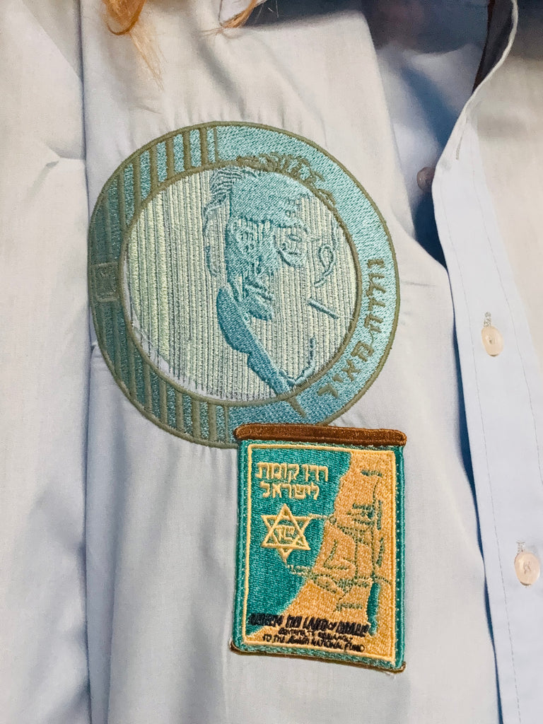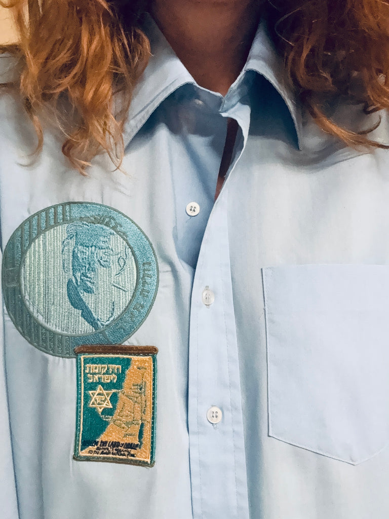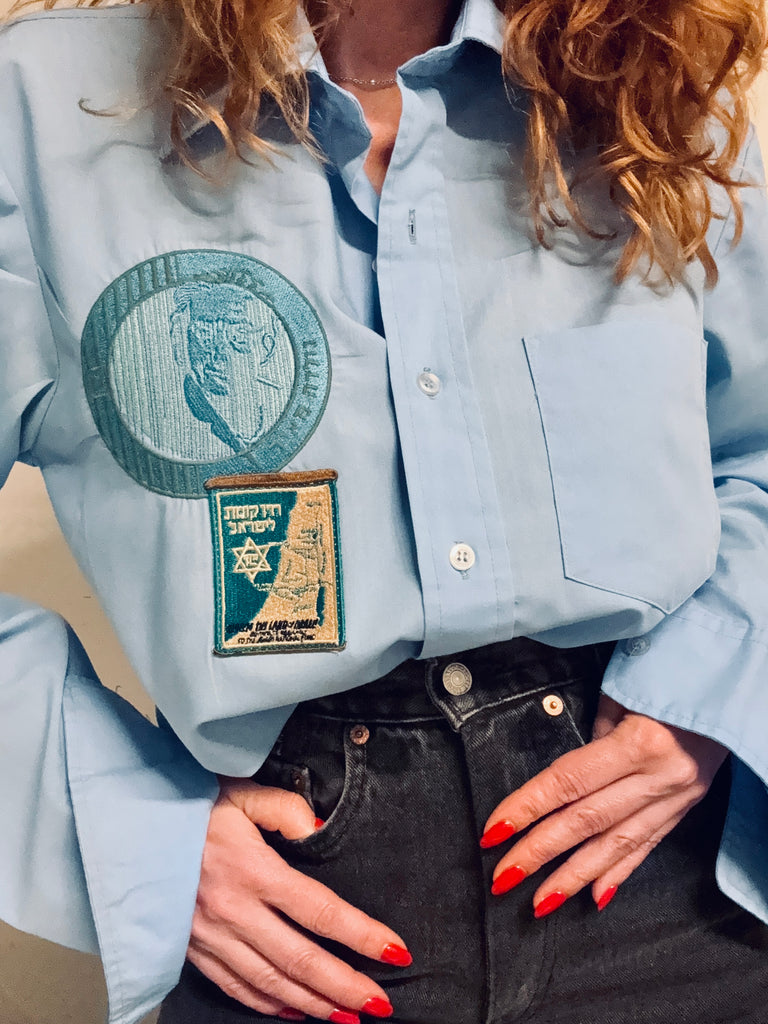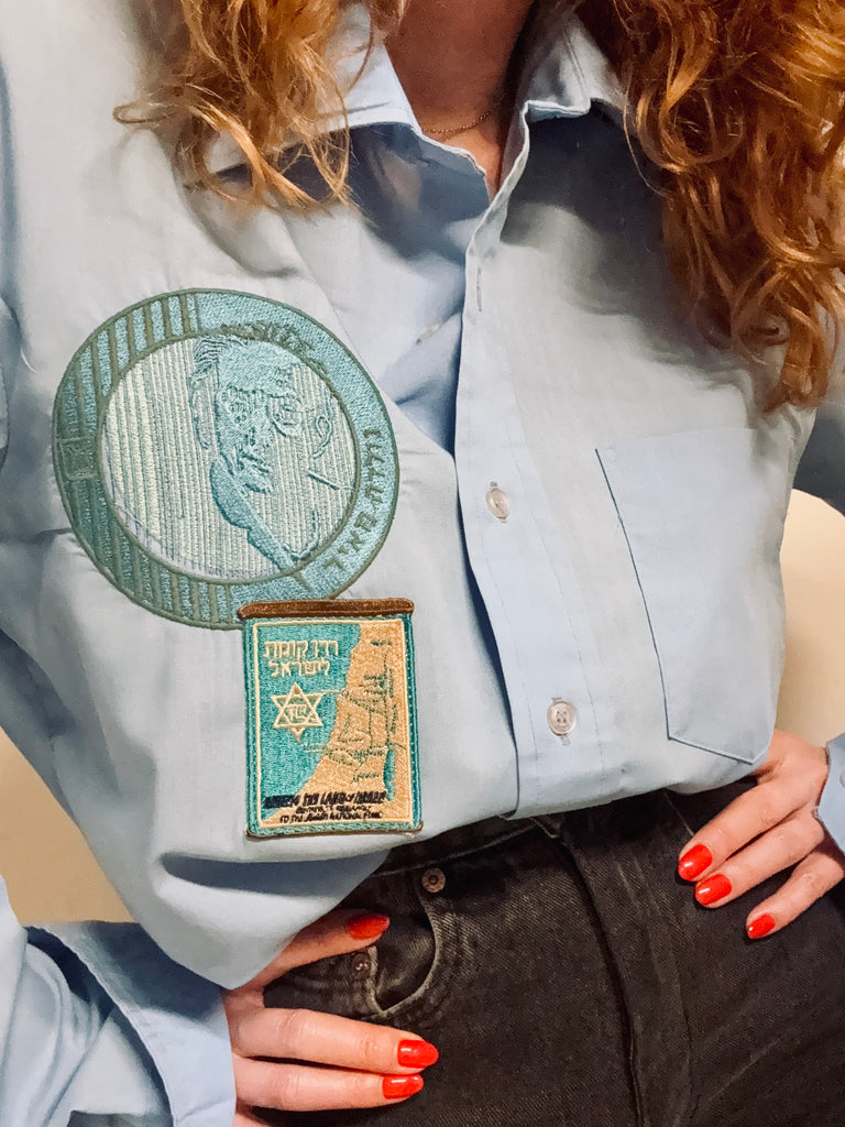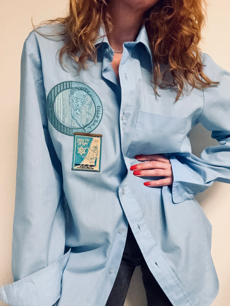Chemise pour homme légère bleue, Shekel brodé et tsedaka patché … Pièce unique 🧵